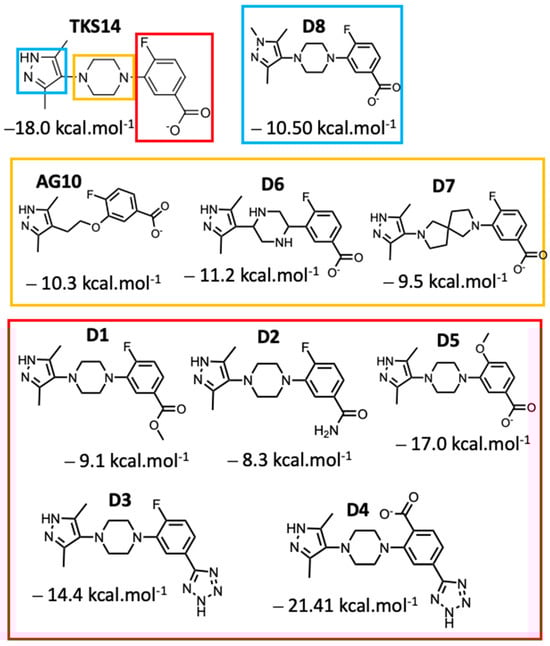 The structure of the AG10 ligand complexed with Val122Ile was taken from the Protein Data Bank (PDB code 4HIQ) [28]. To generate the complexes containing TKS14 and the derivatives shown in Figure 2, the AG10 complex was edited with the software package MOE (Molecular Operating Environment, Chemical Computing Group Inc., Montreal, QC H3A 2R7, Canada) [29]. The AG10 methylene chain was replaced with a piperazine ring to give TKS14. The other functional groups were modified in a similar manner. In receptor–ligand complexes containing TKS14 and derivatives D4–D8, the ligand charge was −1. In complexes D1–D3, the ligand charges were neutral. Atomic charges for the heavy atoms in TKS14 and derivatives D1–D8 are given in Supplemental Figure S1. The MOE software program was also used to add missing residues to the proteins’ N and C termini.