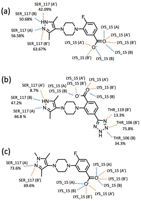 Similar hydrogen-bonding interactions occurred in the receptor’s A’B’ pocket with the hydrogen bonds generally having a greater percent occupancy than in the AB pocket described above. The carboxylate-Lys-15 hydrogen bonds, for example, had percent occupancies of 68.5% and 17.9% in the A’B’ pocket, compared to 46.0% and 30.0% in the AB pocket. The same trend was observed with the hydrogen bonds between the pyrazole ring and Ser-117 residues. However, when the hydrogen bonding in both pockets is considered, despite small differences in the percent occupancies, the values were similar, and the hydrogen bonds formed between the same residues.