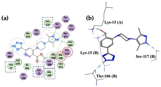 Figure 6 shows two alternative depictions of the ligand–receptor interactions experienced by the D4 ligand. In Figure 6a, a structure was extracted from the MD simulation at 63.7 ns and MOE was used to generate a ligand interaction map for the 63.7 ns timestep. The structure at 63.7 ns was chosen because it had a low RMSD with respect to the average structure. The map in Figure 6a shows the Val122Ile residues that are near the D4 ligand in the HBP. H-bonds formed between the ligand and receptor Thr-106, Ser-117, and Lys-15 residues are shown as well. In the map, polar or charged residues are purple and non-polar residues are green. Analogous ligand binding maps extracted at 10.56 ns and 98.45 ns showing the same ligand–receptor interactions are shown in Supplemental Information Figure S4. In the Figure 6a ligand map, a box is drawn around the TTR residues in the P2 part of the HBP (Leu-17, Lys-15, Ala-109, and Leu-110 of monomer A and Lys-15 of monomer B). Likewise, a red circle is drawn around TTR residues in the P3 part of the HBP (Ala-108 and Thr-119 of monomer A). Finally, Figure 6b shows another depiction of a structure also extracted from the MD simulation at 63.7 ns. Here, the ligand as well as Val122Ile residues Thr-106, Ser-117, and Lys-15 are shown. Again, both the ligand–receptor two-point interaction and the H-bond formed between the D4 tetrazole ring and Val122Ile Thr-106 residues are evident in Figure 6b.
