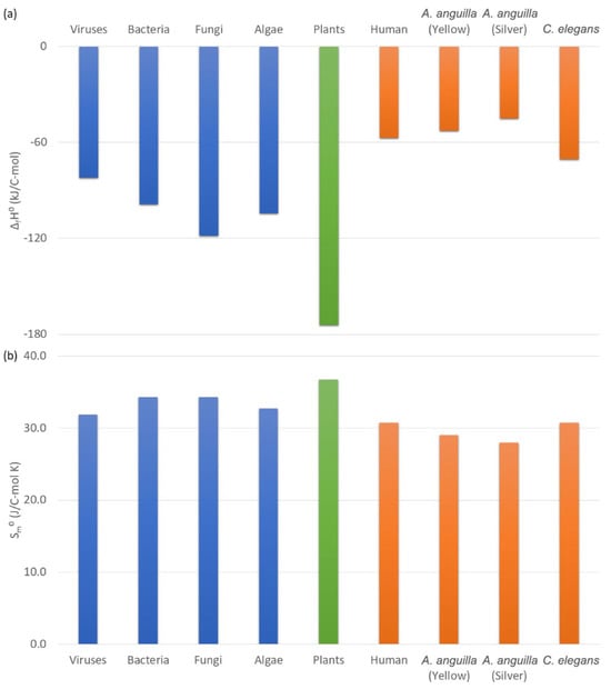 Attempts were made to extend biothermodynamic models of growth and metabolism to multicellular organisms. Growth and metabolism of plants and algae were analyzed using growth reactions [19,27]. Growth reactions of plants have a similar form to those of microorganisms, but the nutrients are CO2, water, and inorganic ions, while the additional product is oxygen [19,57]. The driving force for growth and metabolism of organisms is Gibbs energy [10,19]. Gibbs energy expenditure was used to analyze competition between plants [26]. Moreover, biothermodynamic models were used to discuss the growth and stress resistance of plants [25,58,59]. Furthermore, a mechanistic model of animal growth and metabolism was reported for the fish species Anguilla anguilla (European eel) [46] and the insect Bombyx mori (domestic silk moth) [60]. However, very little data on the chemical and thermodynamic properties of animal species are available in the literature. Chemical and thermodynamic data are important since they are the basis for biothermodynamic analysis.