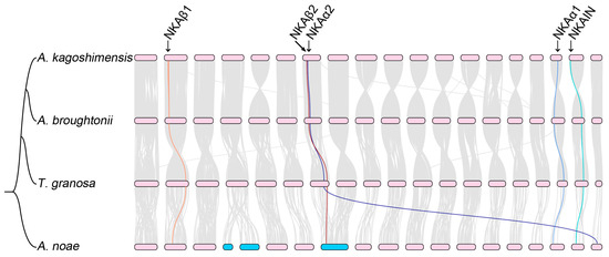 Comparative genomic analysis of the selected assemblies. The collinearity of gene orthologs is represented by gray lines. The collinearities of the NKA subunits are distinctly highlighted with differently colored lines. Chromosome fusion and fission events in A. noae are marked in light blue.