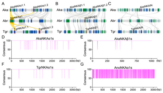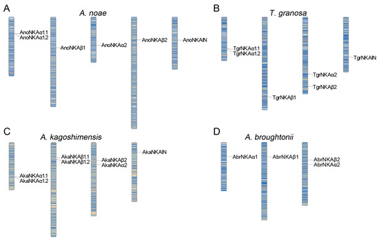 To investigate the evolution and genomic organization of the NKA complex in ark shells, we performed genome-wide searches using selected genome assemblies. Our analysis revealed the presence of two NKA-α subunits (designated NKAα1 and NKAα2) and two distinct NKA-β subunits (named NKAβ1 and NKAβ2) in ark shells. Notably, the NKAα1 subunit exhibited independent duplication events within the genomes of A. noae, A. kagoshimensis, and T. granosa (Figure 2A–C). Additionally, the NKAβ1 subunit underwent a specific duplication event in A. kagoshimensis (Figure 2C). Comparative genomic analyses revealed that these duplications arose from independent large-scale intrachromosomal segmental duplication events (Figure 3A,B). Notably, the independently duplicated paralogs of NKAα1 and NKAβ1 displayed significant sequence identity conservation, suggesting that these duplications were preserved under strong evolutionary constraints (Figure 3D–F). However, in A. noae, the duplicated NKAα1 subunits displayed low sequence conservation, suggesting that they may have undergone subsequent functional differentiation (Figure 3G). In addition to the NKA subunits, we identified a single ortholog of NKAIN in most ark shells (Figure 2). Notably, the NKAIN ortholog was absent in A. broughtonii. Our comparative genomic analysis suggested that large-scale intrachromosomal rearrangements are the likely the cause of the absence of this ortholog (Figure 3C). These findings provide insights into the dynamic nature of genome evolution in ark shells and highlight potential differences in the functional roles of NKAIN across species.