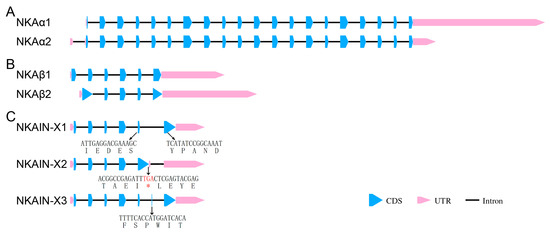 Gene structure and organization of the NKA subunits and NKAIN in ark shells. (A) Gene structure of two NKA-α subunits in ark shells. (B) Gene structure of two NKA-β subunits in ark shells. (C) Gene structure of different NKAIN variants in ark shells.