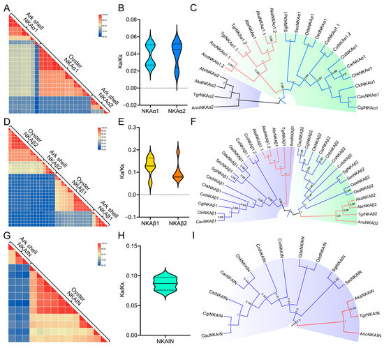 Phylogenetic analyses of the NKA subunits and NKAIN in ark shells. (A) Sequence identity of NKA-α subunits. (B) Selective pressures on NKA-α subunits. (C) Phylogenetic relationships of NKA-α subunits. (D) Sequence identity of NKA-β subunits. (E) Selective pressures on NKA-β subunits. (F) Phylogenetic relationships of NKA-β subunits. (G) Sequence identity of NKAIN orthologs. (H) Selective pressures on NKAIN orthologs. (I) Phylogenetic relationships of NKAIN orthologs.