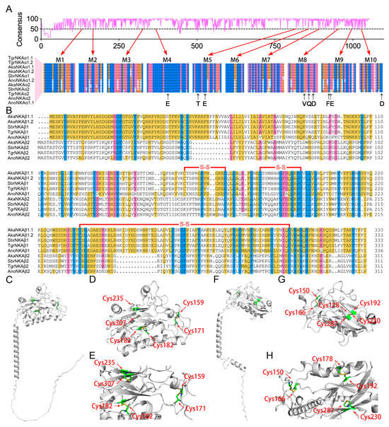 Multiple sequence alignments of the deduced protein sequences for the NKA subunits across diverse ark shells revealed a high degree of sequence conservation within orthologs of the NKA-α and NKA-β subunits (Figure 5). Interestingly, the orthologs identified in A. noae presented significantly reduced sequence conservation compared with those in other species, suggesting a unique evolutionary trajectory for this species (p < 0.05). Conversely, the orthologs shared between A. kagoshimensis and A. broughtonii presented a notably high level of conservation, with sequence identities exceeding 95%, which underscores a particularly close evolutionary relationship between these two species (p < 0.05). These findings highlight the complex evolutionary dynamics and varying patterns of sequence preservation among NKA subunits in these species.