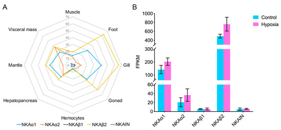 Expression analyses of NKA subunits and NKAIN in ark shells. (A) Tissue-specific expression of NKA subunits and NKAIN in ark shells. (B) Expression level of NKA subunits and NKAIN in response to hypoxia in hamolymph.