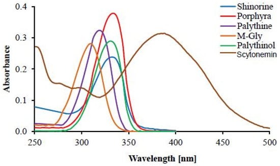 Their absorption spectra are characterized by a single sharp peak with a width of approximately 20 nm and are only about 2–3 nm away from the of structurally similar MAAs (see Figure 2, ref. [64] making it very difficult to distinguish these compounds based solely on their absorption spectra [57,65,66].