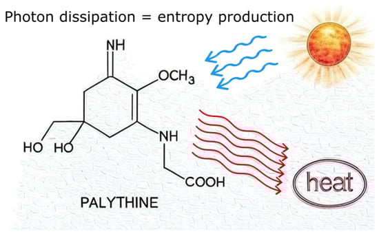 A molecule of palythine absorbs high-energy ultraviolet photons and dissipates their energy as multiple lower-energy infrared photons, thereby producing entropy.