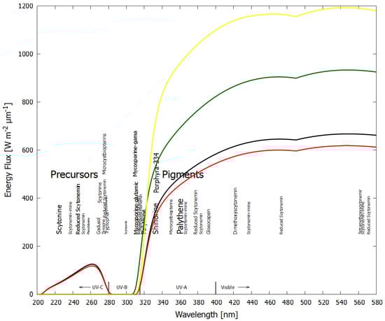 - Inability to explain the production of the strongly UV-C/UV-B-absorbing methoxyscytonemins and scytonine, in spite of the absence of UV-C wavelengths and the low intensity of UV-B in today’s surface solar spectrum. The question is raised by Varnali and Edwards [81].“The realization that scytonemin is the parent molecule of perhaps a whole family of related molecules is important in that an analytical challenge is generated to detect these family members in admixture and in the presence of each other naturally, and also the question is raised about the role of these molecules in the survival strategy processes involving scytonemin; what subtle changes to the radiation absorption process require molecular modification of what apparently is already a highly successful radiation protectant, especially when the molecular syntheses are accomplished in energy-poor situations?”