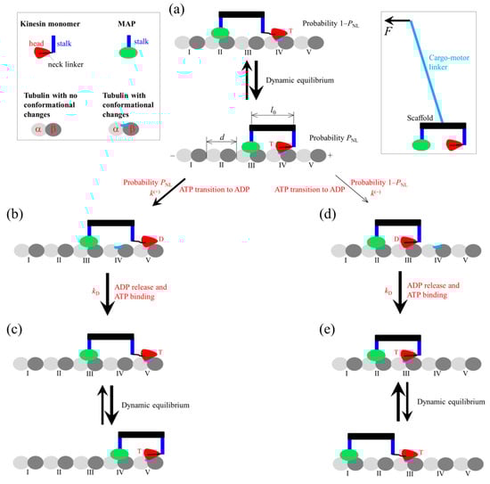 On the basis of the characteristics of the kinesin monomer and MAP, the movement of the engineered motor can be illustrated in Figure 1 (with m = 1). We start with the monomer in the ATP state binding strongly to tubulin IV and MAP binding to tubulin III, where the monomer has the large change in its conformation relative to that in nucleotide-free state and its NL docks in the forward orientation (lower panel of Figure 1a). MAP cannot diffuse forward to the occupied tubulin IV. (For the case of m > 1, MAP also cannot diffuse to the plus-ended adjacent unoccupied tubulin because this requires stretching the monomer’s NL to a length of 12 nm, which is impossible.) MAP can diffuse backward to tubulin II by overcoming the small energy barrier from the NL docking and large change in the conformation of the monomer [45,46,56] (upper panel of Figure 1a). In the upper panel of Figure 1a, MAP cannot diffuse to tubulin I because this requires stretching the monomer’s NL to a length of 12 nm. Thus, in Figure 1a, due to the large diffusion constant of MAP and the large rate of the large conformational change associated with NL docking of the ATP monomer, the system can transition rapidly between the two states (lower and upper panels), with the two states being in dynamic equilibrium.