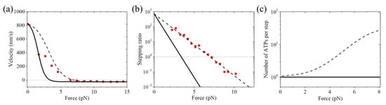 Now, we use Equations (1)–(3) and parameter values listed in Table 1 to calculate the velocity v and stepping ratio r of the engineered motor versus load F, with the results being shown in Figure 2a,b (solid lines). The results for the load dependence of the mean number of ATPs consumed per mechanical step, N, as provided by Equation (4), are shown in Figure 2c (solid line). From Figure 2a, it is interesting to see that under no load the velocity of the engineered motor is the same as that of the WT kinesin dimer. This implies that an ATPase-dependent kinesin monomer plus an ATPase-independent diffusing protein can provide the same velocity as the two ATPase-dependent kinesin heads in the dimer. From Figure 2a,b, it is seen that the engineered motor can provide a maximal force (or stall force) of about 3.4 pN, which is about half of the maximal force of about 7 pN generated by the WT kinesin dimer. More interestingly, from Figure 2c, it is seen that the engineered motor exhibits the tight chemomechanical coupling, with an ATP consumed for a mechanical step under any load. By contrast, only under a near-zero load does the WT kinesin dimer exhibits the nearly tight coupling, with approximately an ATP consumed for a mechanical step, which is consistent with the available experimental data [27,28,29], whereas under a high backward load, the WT kinesin dimer exhibits the non-tight coupling, with multiple ATPs consumed for a mechanical step, as presented before [29]. In other words, for the engineered motor, the decrease of the velocity with the increase of the backward load arises from the decrease of the ATPase rate, while the chemomechanical coupling efficiency (defined as the reciprocal of the number of ATPs consumed per mechanical step) is independent of the load. By contrast, for the WT kinesin dimer, the decrease of the velocity with the increase of the backward load arises from the decrease of the coupling efficiency, while the ATPase rate is independent of the load.