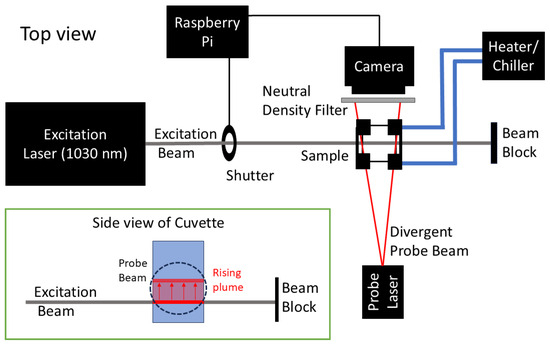 Schematic representation of the experimental apparatus. The excitation beam was generated by a 1030 nm Q-Switched Picosecond Microchip Laser System QSL103A (Thorlabs, Newton, NJ, USA). This produces a rising plume, indicated by red arrows, within the sample. A continuous wave, 650 nm laser diode provided the probe beam. The shutter mechanism, driven by a solenoid, was controlled via a Raspberry Pi 4 computer. An Arducam camera, equipped with a 5 MP Omnivision OV5647 sensor with a neutral density filter in place, was also interfaced with the computer for image acquisition. Temperature control was achieved using an FTS RS33AL10 heater/chiller, (FTS Systems Inc., Marbletown, NY, USA) circulating ethylene glycol, which maintained a stability of ±0.5 °C throughout data acquisition.