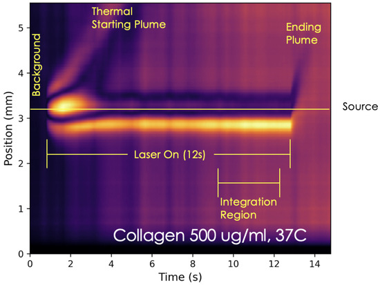 By way of example, a labeled heatmap of the 500 g/mL of collagen at 37 °C is pictured. This heatmap depicts a rising thermal starting plume and laser-induced heat source in this sample. Each consecutive pixel column displayed in the heat map is a compressed frame of the averaged raw video files. These columns/frames are in chronological order from left to right across the heat map. At about 1 s, thermal expansion is pictured when heat is dumped into the sample as the shutter opens and the active phase is initiated. The heatmap depicts the rise of the thermal starting plume frame by frame as one progresses to the right. In these frames, heat is transferred upward in the sample as a thermal plume. Between 3 and 4 s, the top of the plume head can be visualized exiting the frame. The horizontal yellow line represents the axis along which the laser (source) is passing through the sample during the active phase. At about 13 s, the shutter closes and the heated fluid that was in contact with the laser rises in what is termed the ending plume. The vertical extent of the probe beam creates an illumination window of about 5.5 mm. The vertical axis is zeroed at the bottom of the illumination window and the laser is always positioned near the middle of the illumination window. The color range from black to bright yellow captures the absolute value of the difference in probe light intensity as counts on each pixel of the camera relative to background. The count is under complete experimental control.