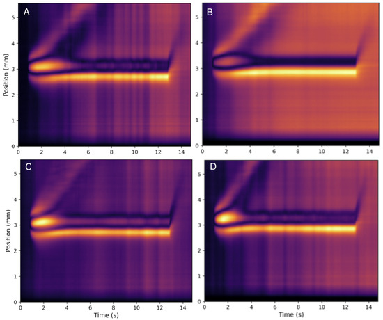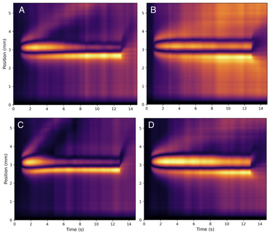 Heat maps for collagen at (A) 25 g/mL collagen at 20 °C, (B) 500 g/mL collagen at 20 °C, (C) 25 g/mL collagen at 37 °C, and (D) 500 g/mL collagen at 37 °C. One notices similar strong convective behavior, as indicated by the pronounced rising thermal plume, for both concentrations and both temperatures with only a mild sensitivity to both parameters.