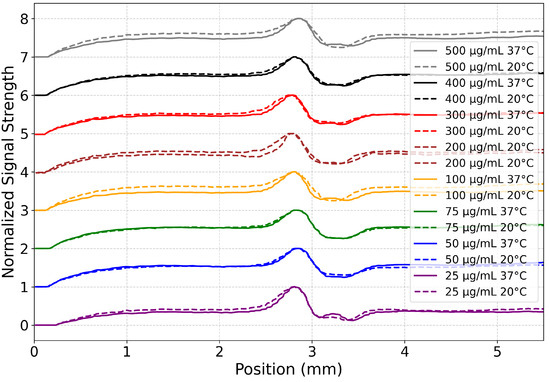 Collagen heat transfer profiles across concentrations and temperatures for 9.5–12.5 s on the heat maps shown in Figure 3. Normalized (between 0 and 1) signal strength from collagen samples at varying concentrations (25–500 g/mL) was plotted from the raw video files. Data are vertically offset by concentration to aid the eye. The central minimums denote the laser heat source across all curves. Each concentration is assigned a unique color, with solid lines representing samples at 37 °C and dashed lines for those at 20 °C. This visualization highlights both concentration- and temperature-dependent changes in heat transfer as a function of vertical position in the raw video files, with a position of 0 mm marking the bottom of the video frame and ≈5.5 mm marking the top. The laser itself is at ≈3.2 mm.