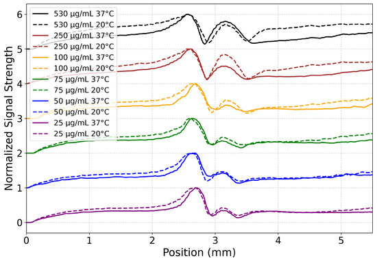 HA heat transfer profiles across concentrations and temperatures for 9.5–12.0 s on the heat maps shown in Figure 5. Normalized (between 0 and 1) signal strength from HA samples at varying concentrations (25–530 g/mL) was plotted from the raw video files. Data are vertically offset by concentration to aid the eye. Each concentration is assigned a unique color, with solid lines representing samples at 37 °C and dashed lines for those at 20 °C. This visualization highlights both concentration- and temperature-dependent changes in heat transfer as a function of vertical position in the raw video files, with a position of 0 mm marking the bottom of the video frame and ≈5.5 mm marking the top. The laser itself is at ≈3.2 mm.