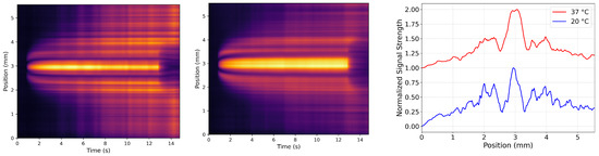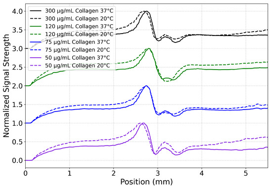 Figure 4 shows the line plot of the heat transfer profile for the selected integration region across the collagen concentrations and temperatures that were examined. The integration region was chosen to be from 9.5 to 12.5 s in the heat map, as this region characterized the center of the heat map after the initial thermal plume had ascended and before the laser was turned off. An image of these line plots is shown in Figure 4. The normalized signal peak on the left at approximately 2.8 mm reflects the accumulation of signal intensity due to thermal conduction in the downward direction. The absence of a significant peak on the right at approximately 3.7 mm is indicative of convective flow in the rising plume. This pattern of asymmetry is present in all collagen concentrations tested and is indicative of convective heat transfer.