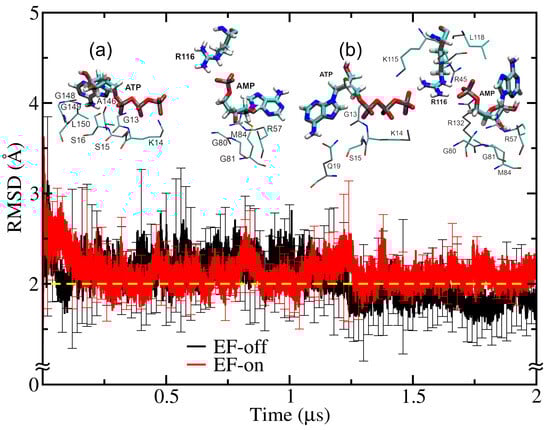 Upon application of an external electric field (EF-on), see Figure 1, the RMSD plot remained constant at ~2 Å throughout the simulation, indicating that SK maintains a higher structural integrity than in the EF-off case, where changes in the RMSD during the runtime were observed beyond 1.25 μs. We noticed that in both the EF-off and EF-on simulations, the RMSD values initially started at a higher value of ~2.5 Å than at the end of the trajectory. These initial values can be caused by the different local arrangements of the residues in the binding site, as well as in the positioning of the ATP and AMP ligands. These changes are illustrated in the insets (a) and (b), which show the binding site residues, located within 3 Å of ATP and AMP, at the beginning (0.021 μs) and the end of the MD trajectory (2 μs), respectively.