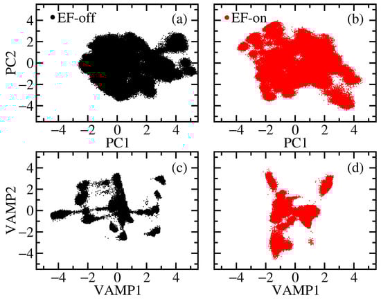 Dimensionality reduction of the MD trajectories: (a,b) show the PC projections onto the first two components in the EF-off and EF-on cases, respectively; (c,d) display the corresponding VAMP projections for the EF-off and EF-on cases, respectively. MD data is more efficiently clustered with the VAMP method.