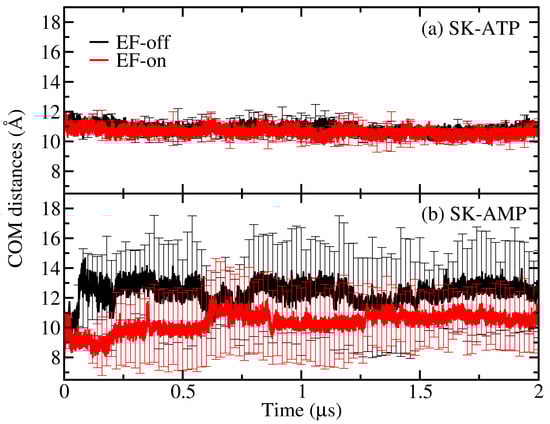 Stability of the ATP and AMP ligands in the binding pocket of SK measured by the COM distances between the ligands and protein structures. The EF-off and EF-on cases were considered in the COM distances analysis. (a) COM between ATP and SK displaying high stability of this ligand; (b) COM between AMP and SK, showing that in the presence of an EF (EF-on), AMP is stabilized.