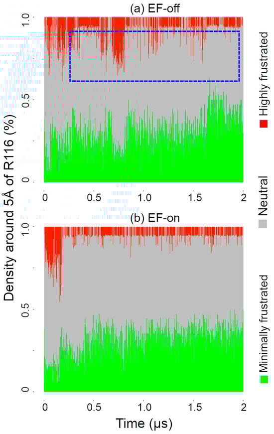 To assess the validity of our results, we conducted simulations with two replicas for both the EF-off and EF-on cases. The plot with the frustration analysis for these cases can be seen in Figure S1a–d in the Supplementary Materials. In these simulations, we notice that the region related to the highly frustrated interactions was similar in the EF-off (Figure S1a,b) and EF-on (Figure S1c,d) cases. However, the region corresponding to the minimally frustrated interactions increased, as can be seen in the area enclosed by the blue rectangle in Figure S1c,d. Thus, taken together, these results suggest that the effect of the external field is to reduce the level of frustration for the selected region around R116 residue either by decreasing the number of highly frustrated interactions or by increasing the minimally frustrated interactions.