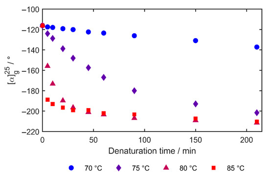 This observation agrees with the incremental short-time heat effect on BSA solutions measured visually at 589 nm and shown only in a graph [38], but photoelectric polarimetry [9] at 436 nm (or even 365 nm) appears to enable an about twice (or three-times) as sensitive detection of early “cryptic” structural perturbations. It is, however, noteworthy that the protein denaturation kinetics depends both on the time and on the temperature [37,38,39,52]. Even at 80 °C, it still took approx. 2.5 h to achieve a constant rotation of a solution containing 5 mg mL−1 β-lactoglobulin heated directly in a water-jacketed polarimeter tube, while at 60 °C, the rotation increase was still in progress after 6 h [39]. The short-term thermal stress of 10 min will thus most likely not perturb the protein structure to the maximum extent.