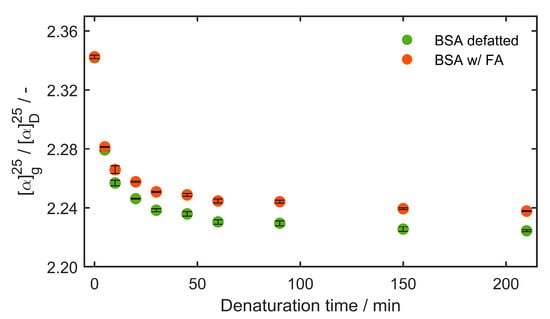 Polarimetry was further used to investigate small differences in the denaturation behavior between BSA with fatty acids compared to defatted BSA. Ma et al. employed far-UV circular dichroism spectroscopy to show that fatty acids can stabilize BSA by inserting into hydrophobic pockets, whereas defatted BSA exhibits greater conformational flexibility and is therefore more susceptible to unfolding [58]. Figure 2 (and Tables S8 and S9) show the progression of the ratio of the specific rotation [α]g25 and [α]D25 of BSA with and without fatty acids with increasing denaturation time at a denaturation temperature of 60 °C. These results show a faster and more extensive denaturation of defatted BSA compared to BSA with fatty acids and confirm the previously reported stabilization effect of fatty acids in protein denaturation.