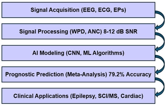 A summary of the study workflow. The figure illustrates the integrated role of medical physicists, from signal acquisition (wearable EEG/ECG, EPs) through processing (WPD, ANC), AI modeling (CNN, ML algorithms), prognostic prediction (meta-analysis outcomes), and clinical applications (epilepsy, SCI/MS, cardiac monitoring). The arrows show the data flow, with key metrics (8–12 dB SNR, 79.2% accuracy) annotated.