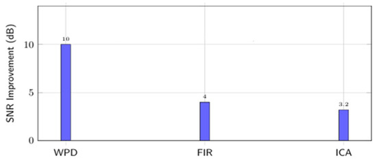 Comparison of signal-to-noise ratio (SNR) improvements. The bar chart shows SNR gains using WPD (8–12 dB) versus FIR filters (3–5 dB) and ICA (3.2 dB) in EEG denoising, highlighting WPD’s superiority for non-stationary signals [11].