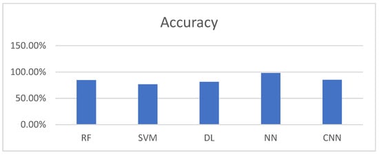 The accuracy of ML methods for SCI/MS prognosis. The box plot illustrates accuracy for RF (84.7%), SVM (76.5%), DL (81.2%), NN (98%), and CNN (85%) from the meta-analysis, demonstrating higher performance in NN for MS progression [2].