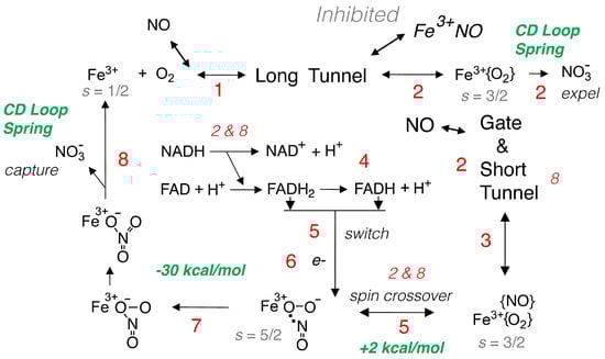 In the NOD catalytic cycle model, ET transfer to the ferric heme is activated by weak O2 and NO SOC [18,74]. Kinetic and structural evidence support controlled ET from the FADH2 to the ferric heme (Figure 1, step 6). The existence of a spin crossover (SC)-driven switch (Figure 1, step 5) is supported primarily by theory but also by the combined effects of O2 and key side-chain substitutions on the ferric heme spin state, steady-state kinetics, and ligand binding kinetics [74,75]. The stepwise ordered motions and kinetics of the ligands and flavoHb-NOD structure during the catalytic cycle have been previously described in detail elsewhere [18,75] and are briefly summarized in the legend to Figure 1