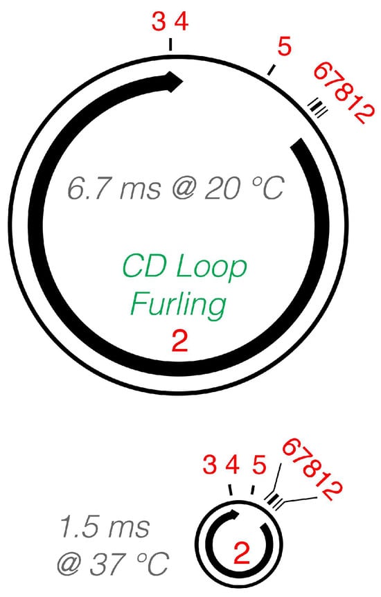 Another aspect of the model requiring emphasis here is the role of stored energy in the proposed ET switch mechanism. The ET switch requires protein motions and an estimated +2 kcal/mol of energy [74]. The NO dioxygenation reaction (step 7) produces NO3− and −30 kcal/mol of free energy that is utilized in the ET switch mechanism. The NO3− anion is produced in the hydrophobic distal pocket and migrates to the CD-loop and is captured in an anion hole of the unfurled spring-like CD loop (step 8). Energy is presumably stored through steric repulsion forces in the loop. To trigger the ET switch, O2 must displace the distal leucine (E11) residue away from its van der Waals contact with the ferric iron. For this motion, O2 is assisted by the structurally stored spring energy of the CD loop with loop re-furling and NO3− expulsion (step 2). The protein motions required for O2 to set the trigger for the ET switch constitute the slow step in the catalytic cycle. In Figure 2, NOD cycle clocks are shown for 20 °C and 37 °C, with the approximate timing of each step of the cycle denoted for the respective 6.7 ms and 1.5 ms turnover times. In the model, transient O2 binding to the ferric heme slowly occurs following the duration of step 2, and it is during this step that the primary gate and short tunnel for rapid NO entry also opens (step 3). Reversible NO inhibition occurs when NO competes with O2 for transient binding to the ferric heme (Equations (20) and (21)).