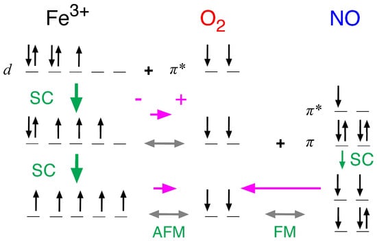 Proposed ferric heme spintronics with O2 and NO SOCs. Antiferromagnetic (AFM) and ferromagnetic (FM) SOC of the ferric heme 3d orbitals with 2π* O2 and 2π*, 2π NO orbitals (grey arrows). Low spin (s = 1/2) to intermediate spin (s = 3/2) to high spin- (s = 5/2) crossover (SC) induced in the ferric heme with O2 and NO SOC (thick green arrows). Enhanced electron density current in ferromagnetic and antiferromagnetic SOC (magenta arrows).