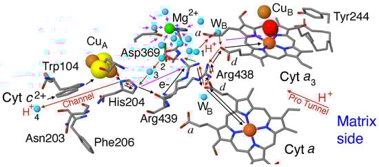 - Popović, D.M.; Stuchebrukhov, A.A. Coupled electron and proton transfer reactions during the O→E transition in bovine cytochrome c oxidase. Biochim. Biophys. Acta (BBA)-Bioenerg. 2012, 1817, 506–517. [Google Scholar] [CrossRef]