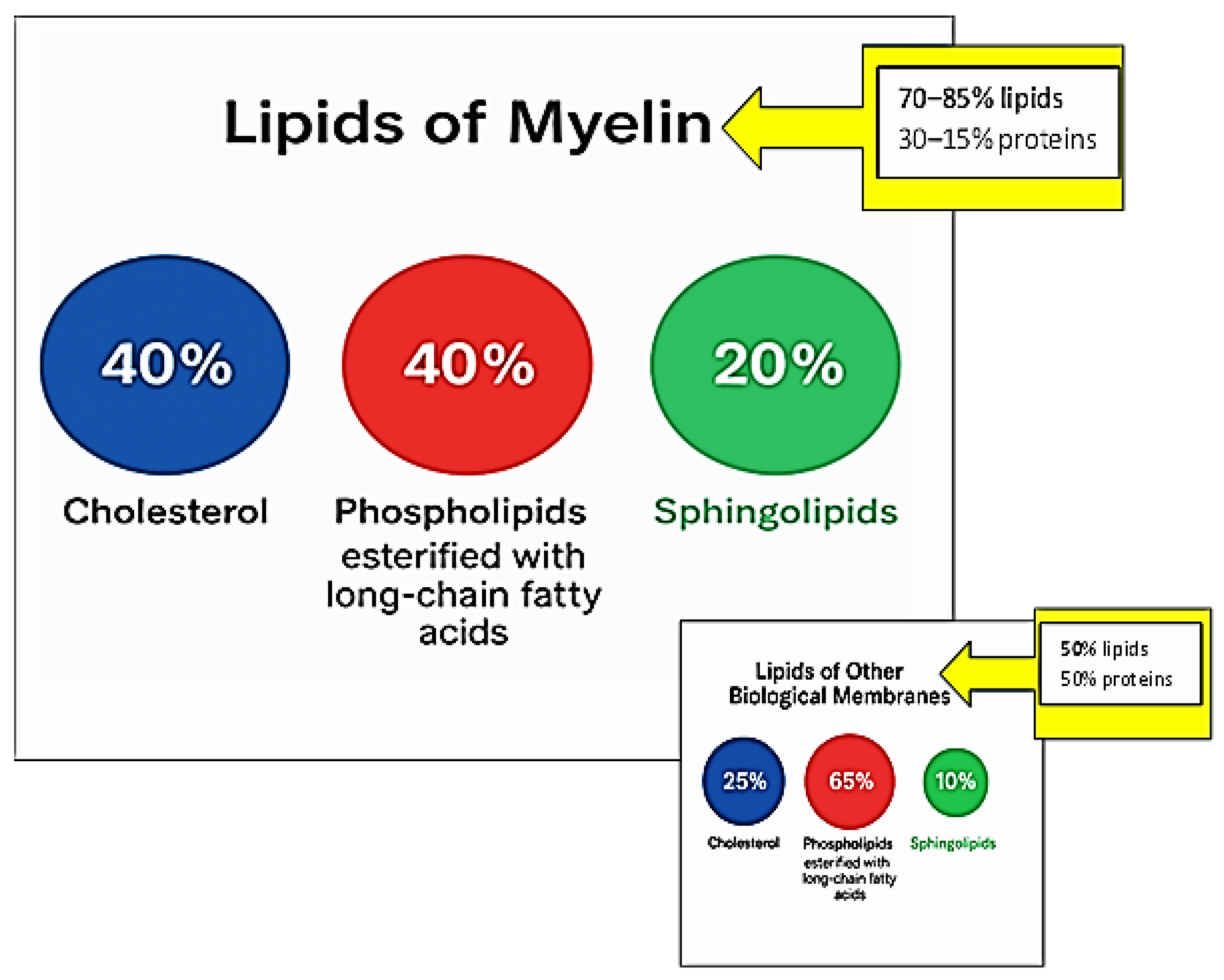 The myelin sheath is characterized by a high lipid content (70–85%) and, consequently, a low protein fraction (15–30%). In contrast, most biological membranes have approximately equal proportions of protein and lipid (50% lipid/50% protein) [5]. This high lipid-to-protein ratio in myelin contributes to its tight packing and compact organization through noncovalent lipid–protein interactions [6]. Moreover, enrichment in specific lipid classes is also necessary for long-term myelin maintenance [7]. Myelin’s lipid composition is distinctive: it contains high levels of cholesterol and is enriched in glycolipids, in a 40:40:20 ratio (cholesterol:phospholipid:glycolipid) compared to most biological membranes (25:65:10) [8]. Figure 2 schematically summarizes the distinctive lipid composition of the myelin membrane in comparison to biological membranes.
