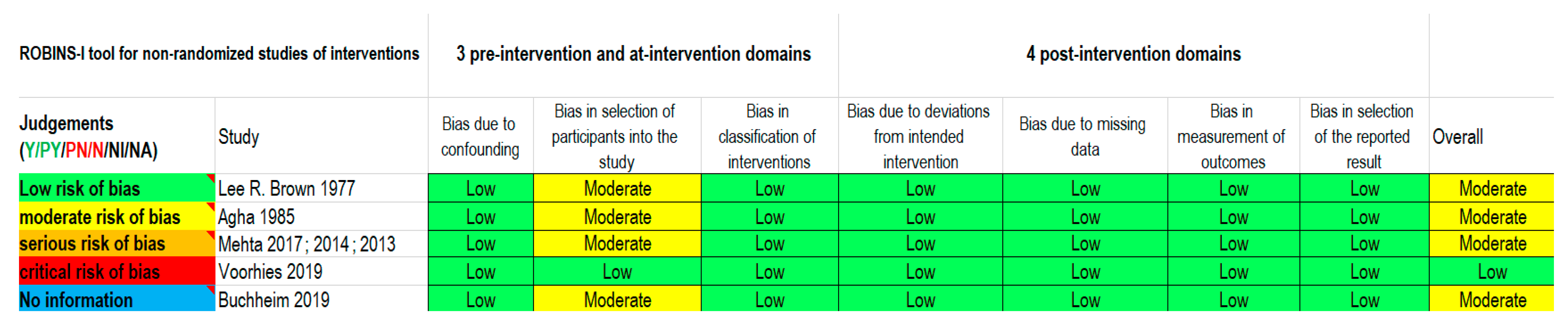 20]. The only domain with a moderate risk of bias for Brown 1977, Agha 2020, Mehta 2013, 2014, and 2017, and Buchheim 2019 [