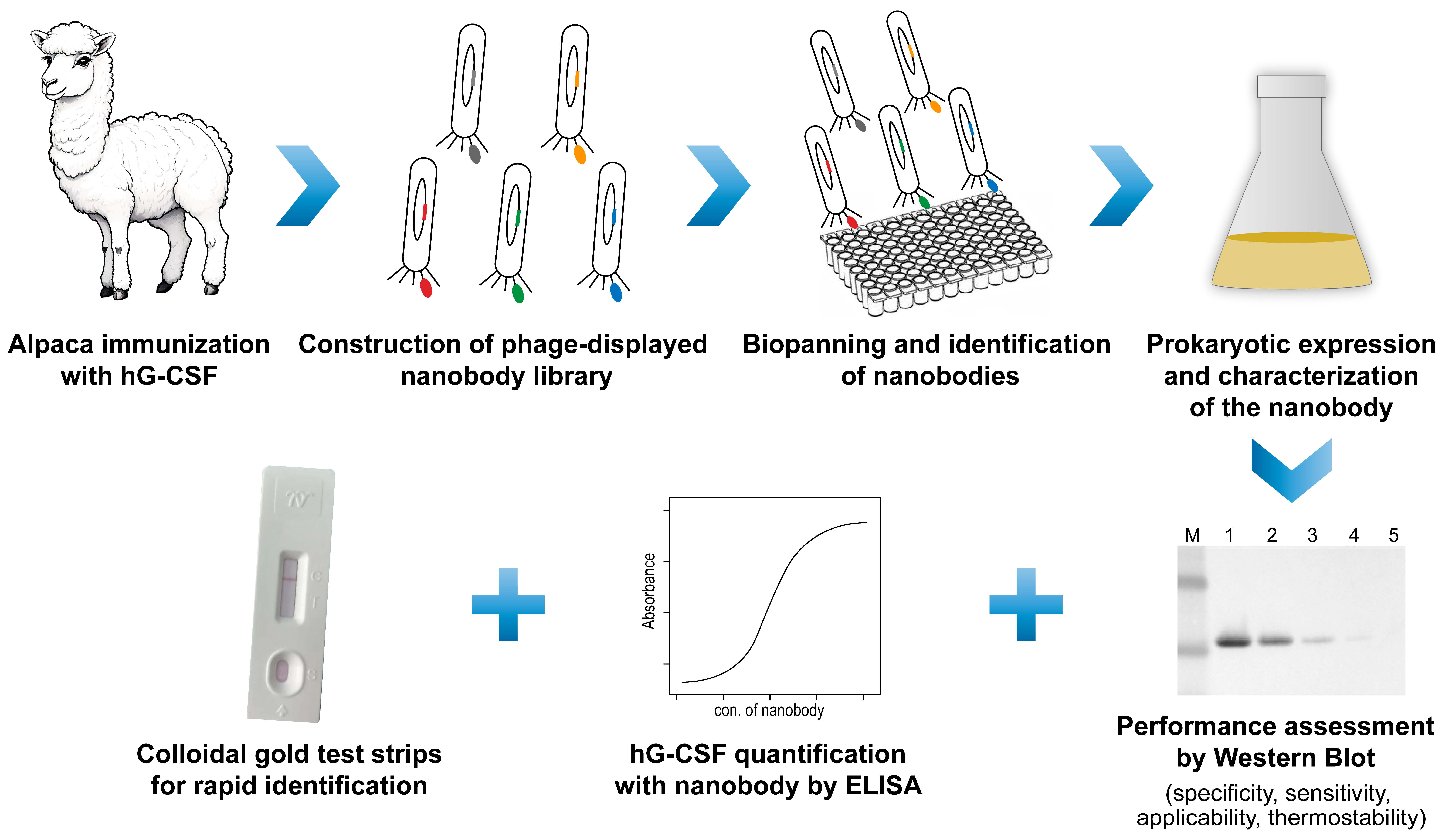 Freund’s complete adjuvant (FCA) and Freund’s incomplete adjuvant (FIA) (F5881 and F5506, Merck, Billerica, MA, USA), Goat anti-Alpaca IgG(H+L)-HRP (053-404-005, AlpVHHs, Chengdu, China), Human Peripheral Blood Lymphocyte Separation Medium (P8610, Solarbio, Beijing, China), TRIzol Plus RNA Purification Kit (12183555, Invitrogen, Carlsbad, CA, USA), SuperScript III Reverse Transcriptase (18080093, Invitrogen, Carlsbad, CA, USA), DNA Gel Extraction Kit (NA1111, Merck, Billerica, MA, USA), Hot Start Taq DNA Polymerase (M0490S, NEB, Beverly, MA, USA), DNA Ligase (M2622S, NEB, Beverly, MA, USA), restriction enzymes NotI, SfiI, MscI, and XhoI (R0189S, R0123S, R0534S, and R0146S, NEB, Beverly, MA, USA), M13KO7 helper phage (N0315S, NEB, Beverly, MA, USA), PEG-NaCl solution (C7052, Bioss, Beijing, China), carbonate–bicarbonate buffer (C3041-50CAP, Merck, Billerica, MA, USA), ELISA microplate (154041, Thermo Scientific, Waltham, MA, USA), TMB Liquid-1 component (J644, Amresco, Solon, OH, USA), BL21 (DE3) competent cells (EC0114, Thermo Scientific, Waltham, MA, USA), isopropyl β-D-thiogalactopyranoside (IPTG, I5502, Merck, Billerica, MA, USA), High-Performance HisTrap column (GE17-5248-01, Cytiva, Marlborough, MA, USA), imidazole (I5513, Merck, Billerica, MA, USA), NuPAGE precast polyacrylamide gel (NP0321BOX, Invitrogen, Carlsbad, CA, USA), DAB Substrate Kit (SK-4105, Vector Laboratories, Burlingame, CA, USA), Coomassie Brilliant Blue (P0017B, Beyotime, Shanghai, China), G-CSF monoclonal antibody (sc-53292, SANTA CRUZ Biotechnology, Santa Cruz, CA, USA).
