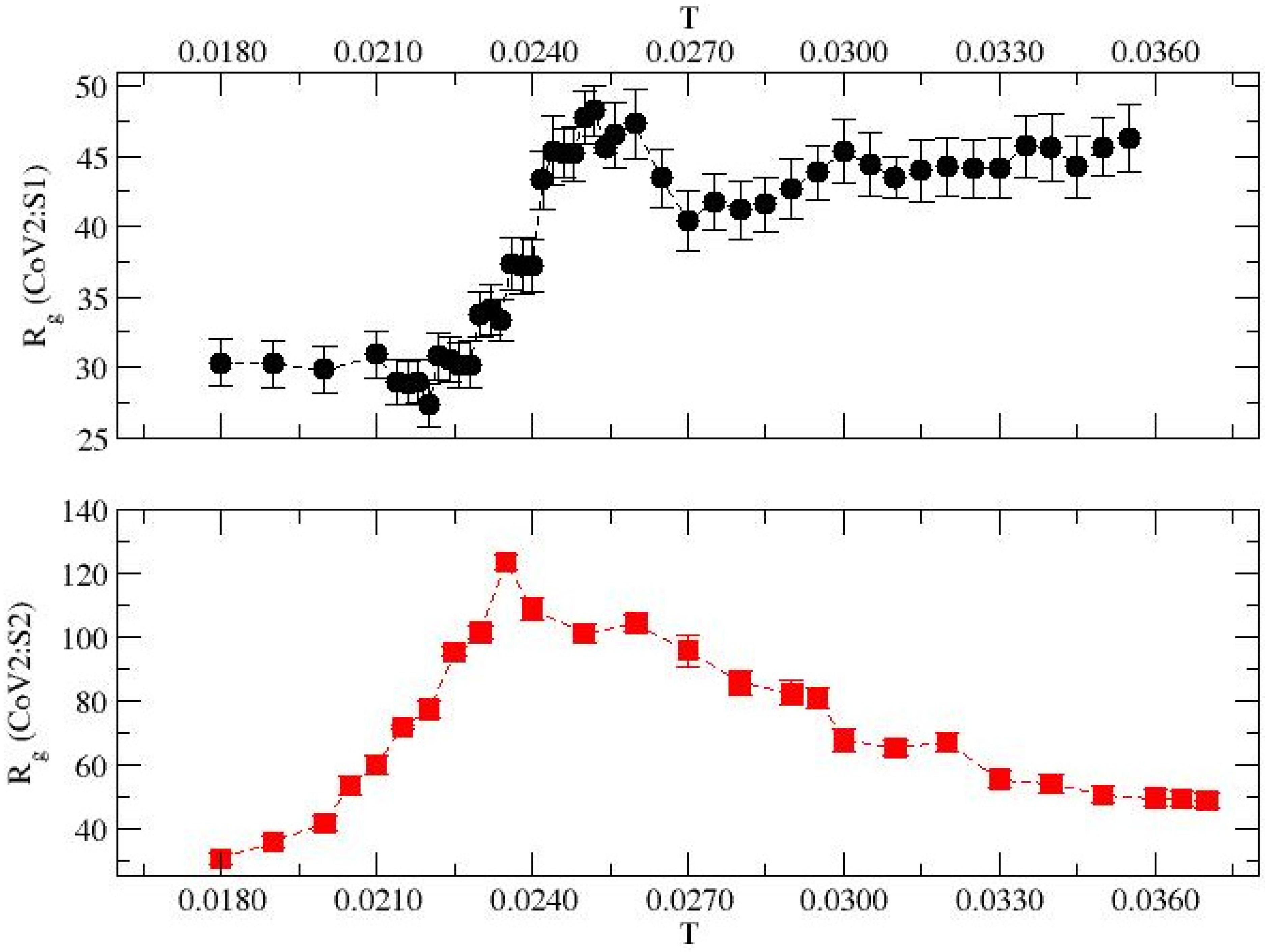 Despite the comparable number of residues in both proteins S1 (685) and S2 (588), the radius of gyration shows dramatic change in their thermal response. First, the radius of gyration of S2 is considerably larger than that of the S1 with very different variation patterns. The radius of gyration of S1 increases (roughly from