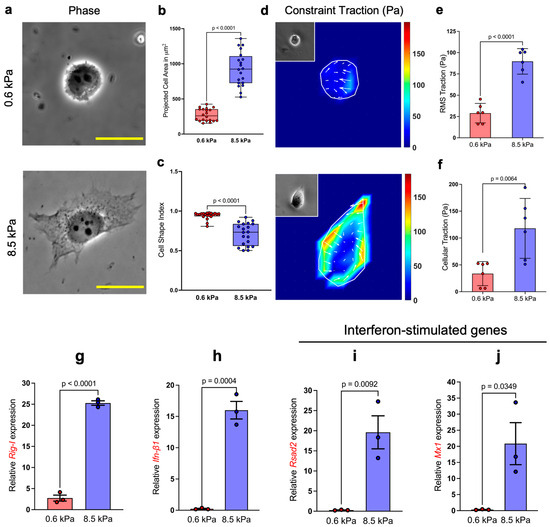 To assess if elevated Ifn-β1 expression translated into an antiviral response and is not just limited by the virtue of enhanced RIG-I, we investigated the expression of Rsad2, widely regarded as one of the ISGs. The product of Rsad2, viperin is an antiviral protein induced by lipopolysaccharide, type-I IFN, and Poly(I:C), and to a lesser extent by type-II IFN [21]. Although Rsad2 expression might be dependent or independent of IFN production, both pathways require the recognition of viral dsRNA through cytoplasmic RIG-I. Consistent with the enhanced Ifn-β1 expression, we observed a ~72-fold increase in Rsad2 expression (Figure 1i) in cells grown on 8.5 kPa substrates, indicating that the elevated response was indeed initiated by IFN-β1. Lastly, we checked the expression of Mx1, a GTPase that is a key player in antiviral response induced by type-I and type-III IFNs and is known to act against a wide range of RNA viruses by interfering with viral replication [22,23]. We found a 47.3-fold upregulation in Mx1 expression in cells grown on the stiffer substrate, corroborating the elevated IFN-β1-mediated antiviral response in these cells (Figure 1j). Taken together, our results revealed that cells experiencing high cytoskeletal prestress exhibited enhanced recognition of Poly(I:C) and mounted a more robust antiviral response compared to cells on softer 0.6 kPa substrates.
