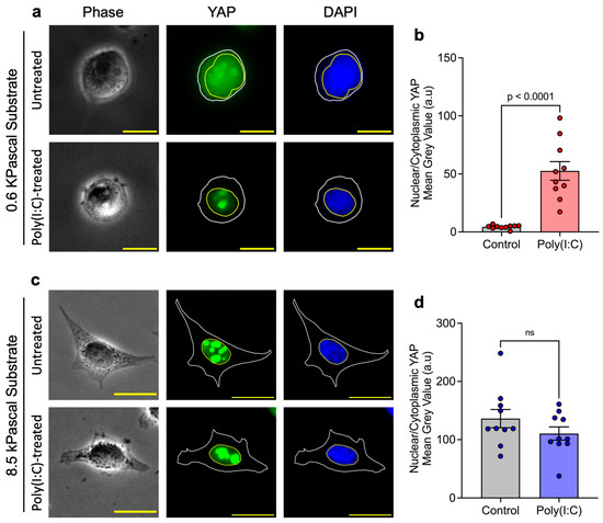 Building on these findings, we hypothesized that the inactive Hippo pathway in cells grown on the stiffer substrate as a result of increased cytoskeletal prestress could facilitate unrestricted TBK1 activation, leading to the enhanced antiviral response. Therefore, we examined the subcellular localization of endogenous YAP in HeLa cells grown on soft (0.6 kPa) and stiff (8.5 kPa) substrates. We observed that cells cultured on soft substrates displayed a relatively modest nuclear-to-cytoplasmic YAP ratio. Upon Poly(I:C) transfection, however, this ratio increased markedly, indicating active translocation of YAP into the nucleus in response to Poly(I:C) stimulation (Figure 2a,b), raising the possibility that nuclear translocation of YAP could be linked to the cell’s antiviral defense. However, the mechanism is not clear at this point. In contrast, cells cultured on stiffer substrates exhibited a complete absence of cytoplasmic YAP, with localization exclusively in the nucleus. Poly(I:C) transfection did not further alter this distribution, consistent with YAP being maximally nuclear under these conditions (Figure 2c,d). Our findings are consistent with earlier work by the Dupont group [25], confirming that HeLa cells grown on stiffer substrates display an inactivated Hippo pathway, as suggested by the high level of nuclear YAP.