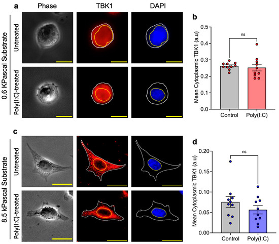 Substrate stiffness influences TBK1 localization in response to Poly(I:C): Representative images of TBK1 localization in untreated and Poly(I:C)-treated HeLa cells cultured on (a) soft 0.6 kPa and (c) stiff 8.5 kPa substrates. (b,d) Quantification of cytoplasmic TBK1 intensity shows no significant difference between untreated and Poly(I:C)-treated cells on either substrate (ns = non significant). Data represent three independent experiments (n = 3). Scale bar, 20 μm.