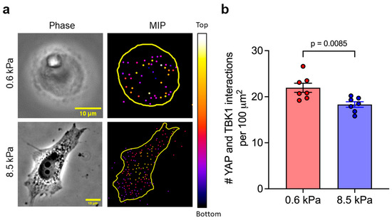 Detection of YAP–TBK1 interactions by proximity ligation assay. (a) Maximum intensity Z-projections of PLA signals show YAP–TBK1 interactions within the cytoplasm. (b) Quantification of PLA signal density, normalized to cell surface area, revealed a higher frequency of YAP–TBK1 interactions in cells on 0.6 kPa substrates compared to those on 8.5 kPa substrates. Depth-encoded projections illustrate the three-dimensional spatial distribution of YAP–TBK1 interactions. The color scale indicates axial position (z-depth), with warmer colors (yellow/white) representing interactions closer to the top of the cell and cooler colors (blue/purple) corresponding to the bottom of the cell volume closer to the underlying substrate. Scale bar, 10 μm.