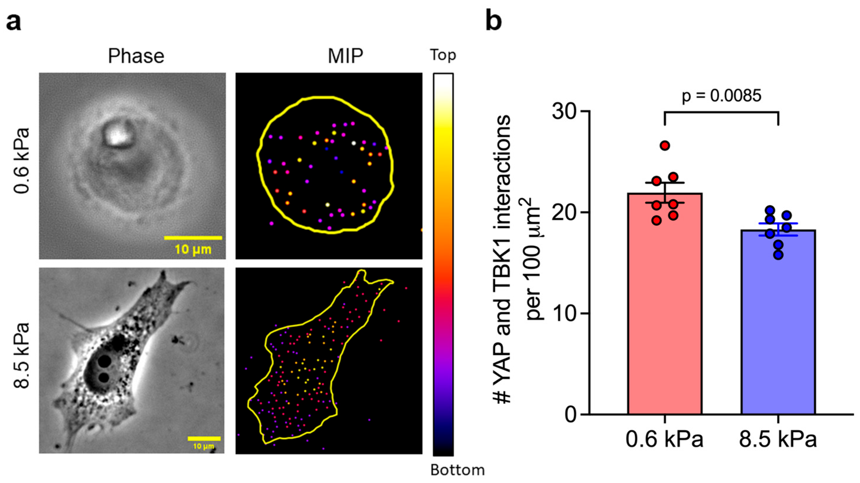 3.3. Cells Experience Enhanced TBK1 Inhibition by YAP on Soft Substrates