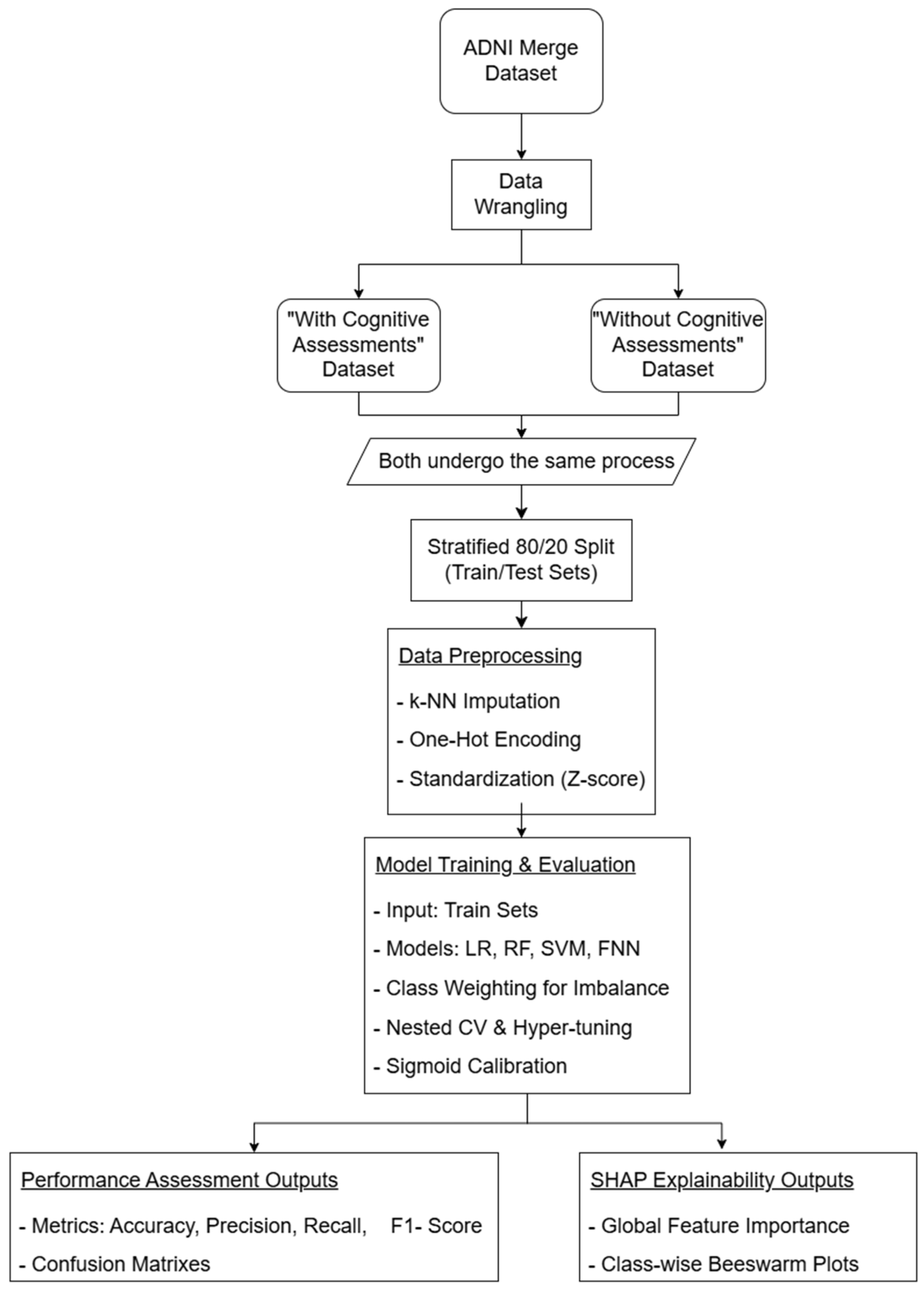 Early diagnosis is crucial for improving patient outcomes; by elucidating model behavior with XAI, we aim to foster clinician trust and pave the way for transparent, data-driven decision support in Alzheimer’s disease care. Launched in 2004, ADNI is a critical study aimed at identifying biomarkers for Alzheimer’s disease through clinical, genetic, and imaging data [