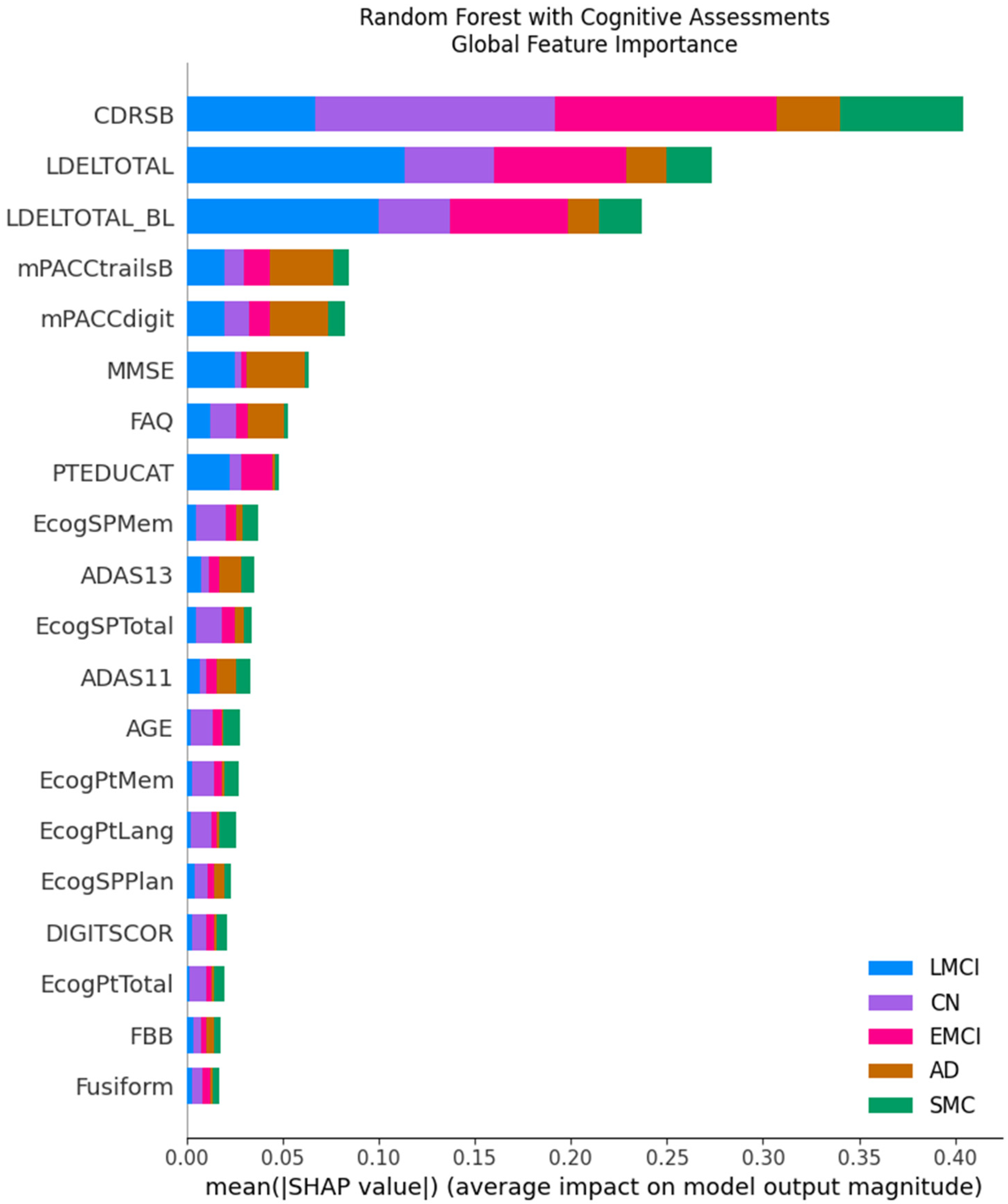SHAP analysis provides a coherent explanatory picture that differs logically and dramatically between the two feature regimes, revealing why the models make their decisions. When cognitive assessments are included, the feature importance landscape is unequivocally dominated by cognitive scores across all model types. For the top-performing RF model, the Clinical Dementia Rating Sum of Boxes (CDRSB) and Logical Memory Delayed Recall (LDELTOTAL) are overwhelmingly the most influential variables, with mean SHAP values far exceeding any other feature (