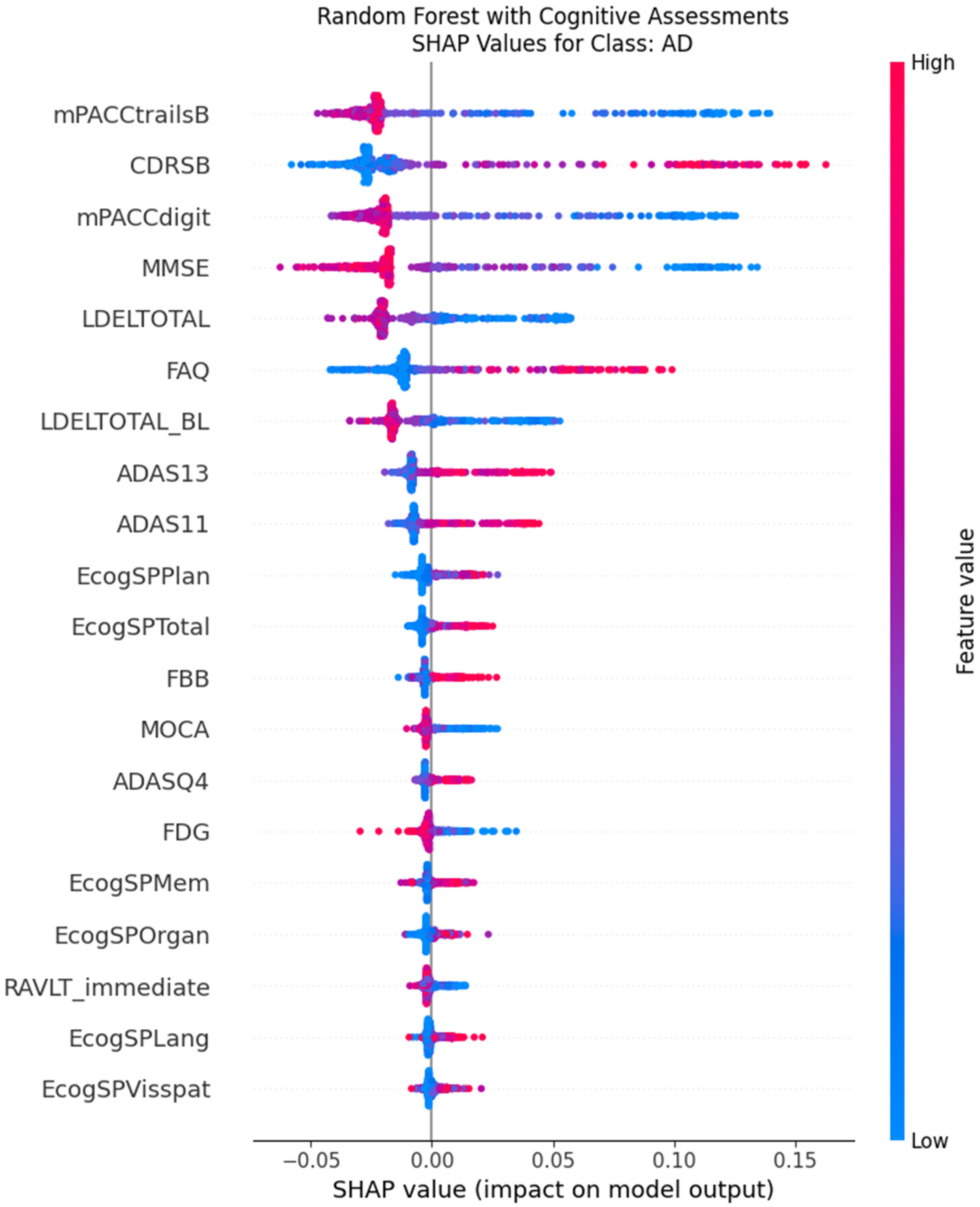 Figure 6). The beeswarm plots confirm this at the instance level; for the AD class, high values of CDRSB (indicating greater impairment, colored red) consistently push the model’s prediction strongly positive, while low values (blue) push it negative (