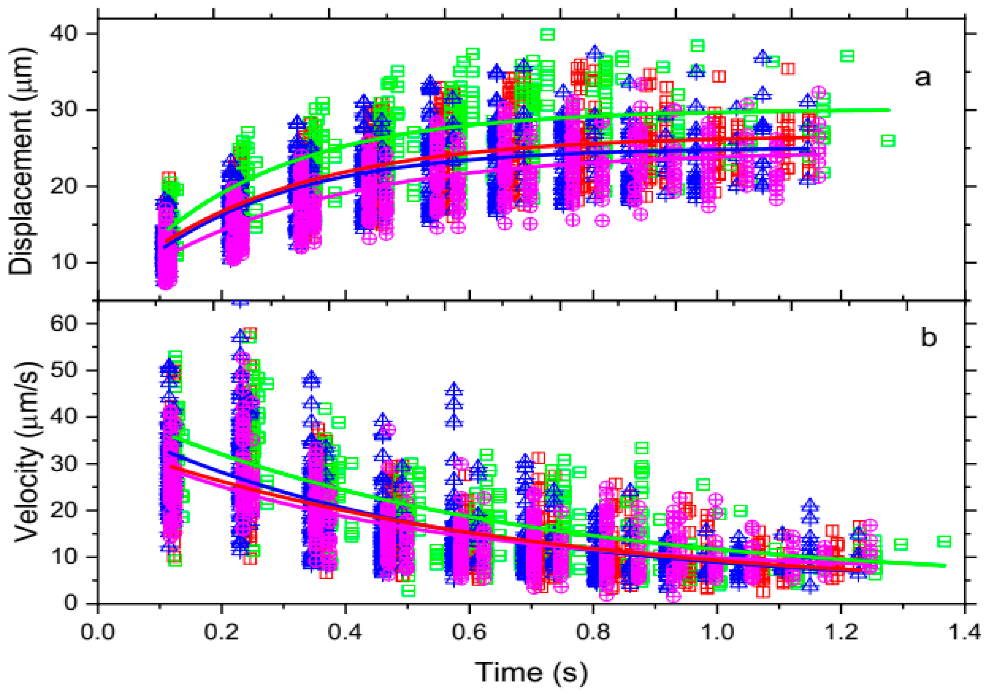 3.1.1. Trajectories of Optically Trapped RBC Motion from Four Blood Samples as a Function of Time