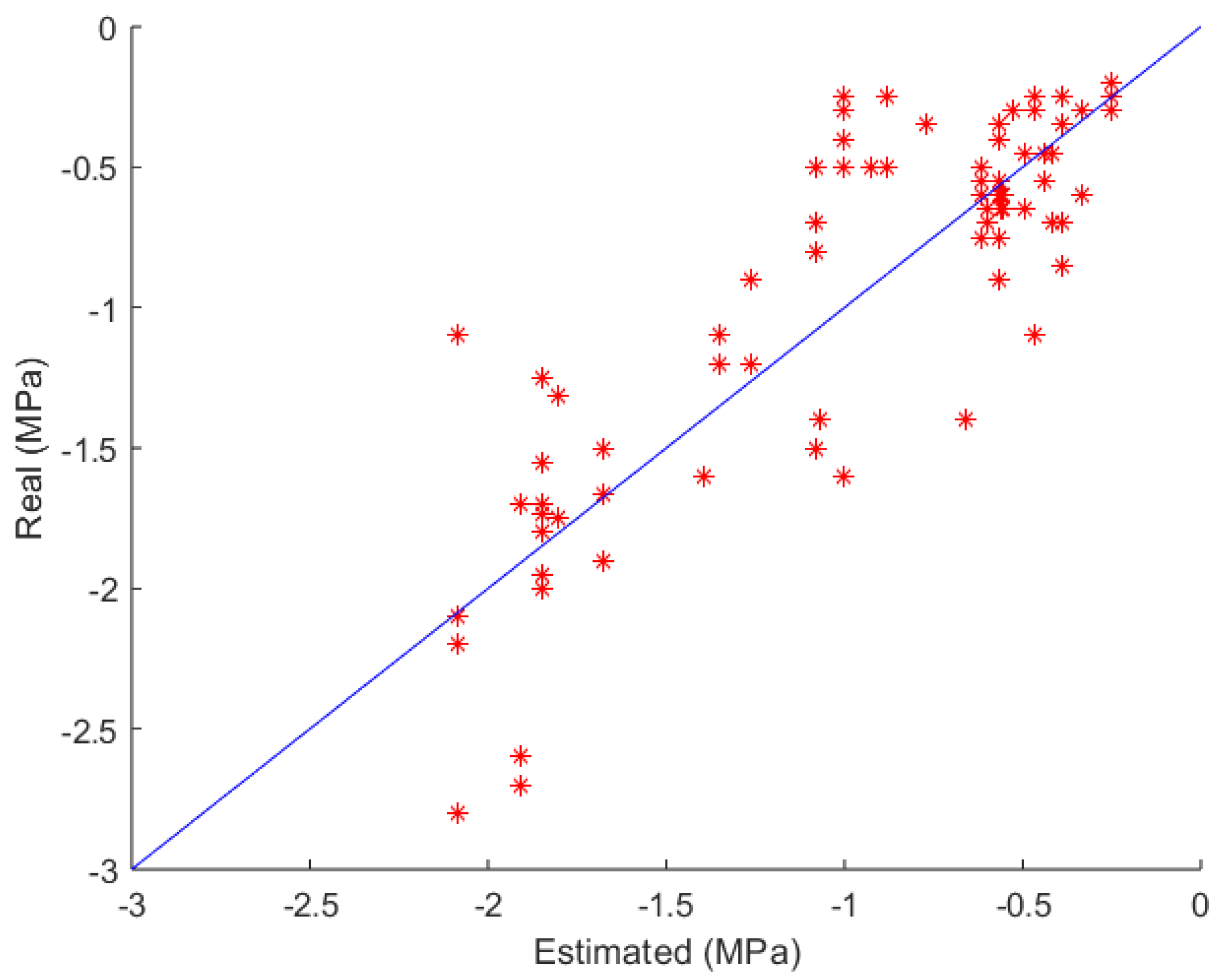 Figure 2 illustrates the predicted values in the best-performing fold for the decision tree model compared to the ideal line (blue line), with errors increasing as the estimated data points move farther from the line, the greater the errors associated with those data points. A noticeable dispersion of data around the ideal line is observed, with the largest errors occurring for water potential values higher than