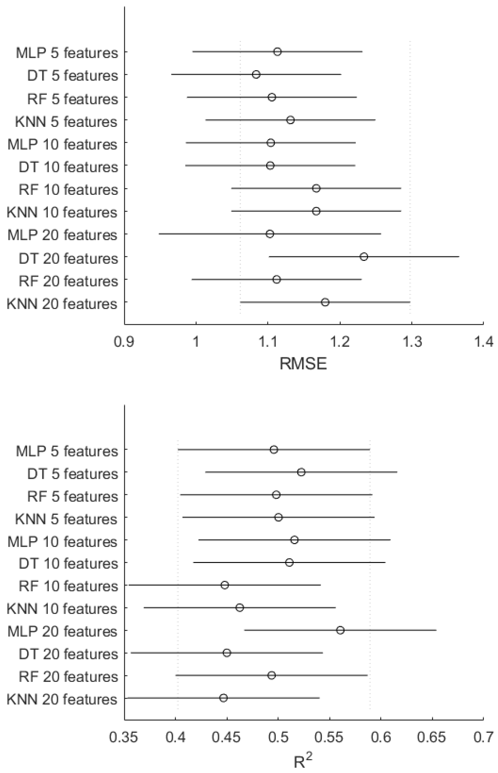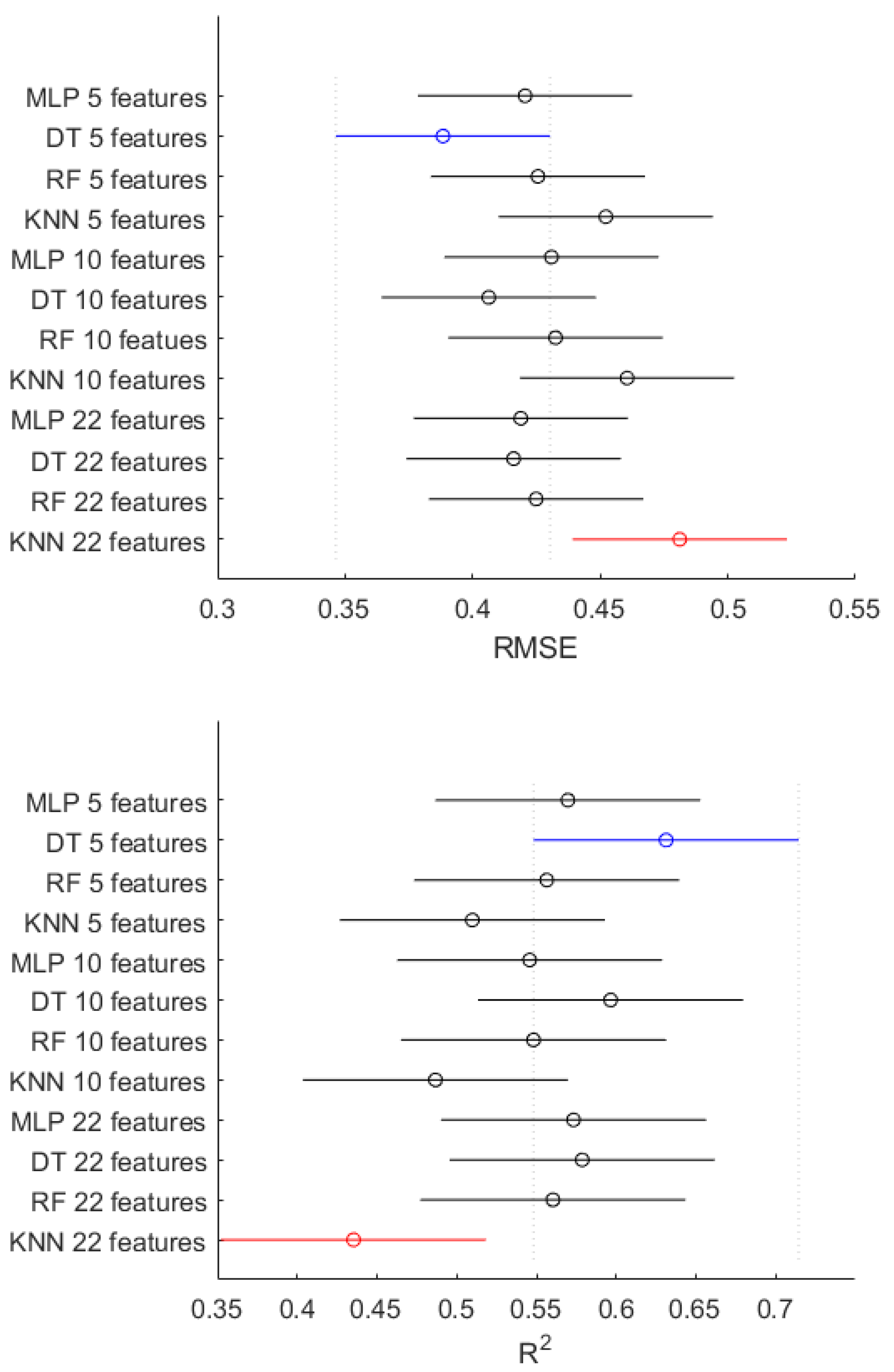 Figure 5, where the confidence intervals of the model–feature combinations show substantial overlap.