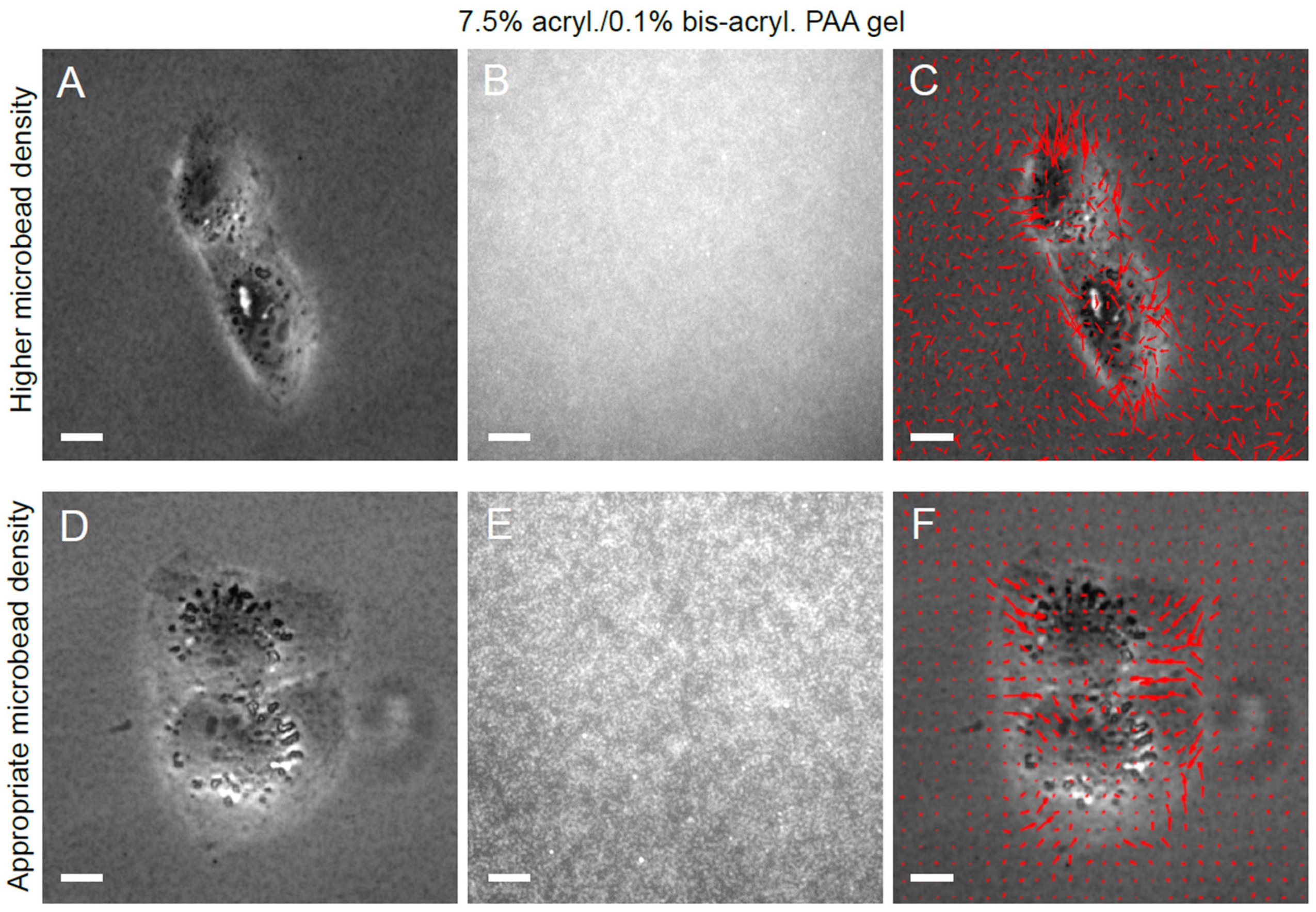 - Xu, Y.; Guo, C.; Yang, X.; Yuan, W.; Zhang, X.; Sun, Y.; Wen, G.; Wang, L.; Li, H.; Xiong, C.; et al. Super-resolution traction force microscopy with enhanced tracer density enables capturing molecular scale traction. Biomater. Sci. 2023, 11, 1056–1065. [Google Scholar] [CrossRef] [PubMed]